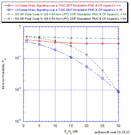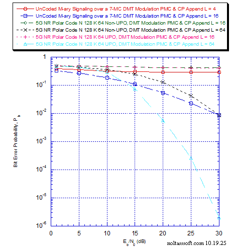 Figures 1 - 5 clearly shows the effect of choosing the appropriate Cyclic Prefix Length (L), i.e., the number of IFFT samples used for the DMT Symbol-based Cyclic Prefix and the effect of using or not using the 5G NR UPO method of choosing the set of Bit-Coordinate Channels to transmit the Information Bits ('free' bits).