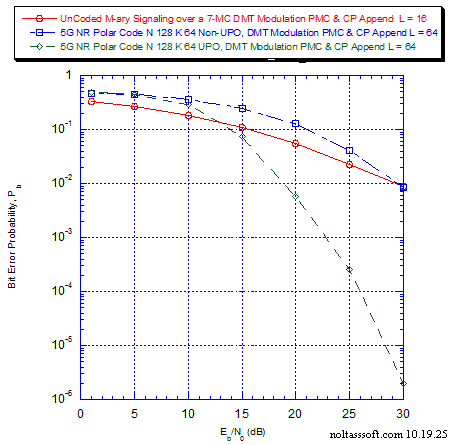 b) performance of each simulated Polar Coded 7-MC per group DT FFT-based DMT Modulation PMC (28 SubCarriers/SubChannels, CP of 16 or 64 IFFT samples) with Raleigh Fading Communications (Comm) system was obtained and compared to the BER performance of a UnCoded M-ary Signaling over a 7-MC DT FFT-based DMT Modulation PMC Communications (Comm) system for each Information Bit Signal-to-Noise Ratio (E